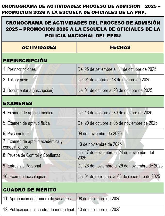 La preinscripción para el Proceso de Admisión 2025 - Promoción 2026 a la Escuela de Oficiales de la Policía Nacional del Perú (PNP) está programada del 25 de septiembre al 11 de octubre de 2025
