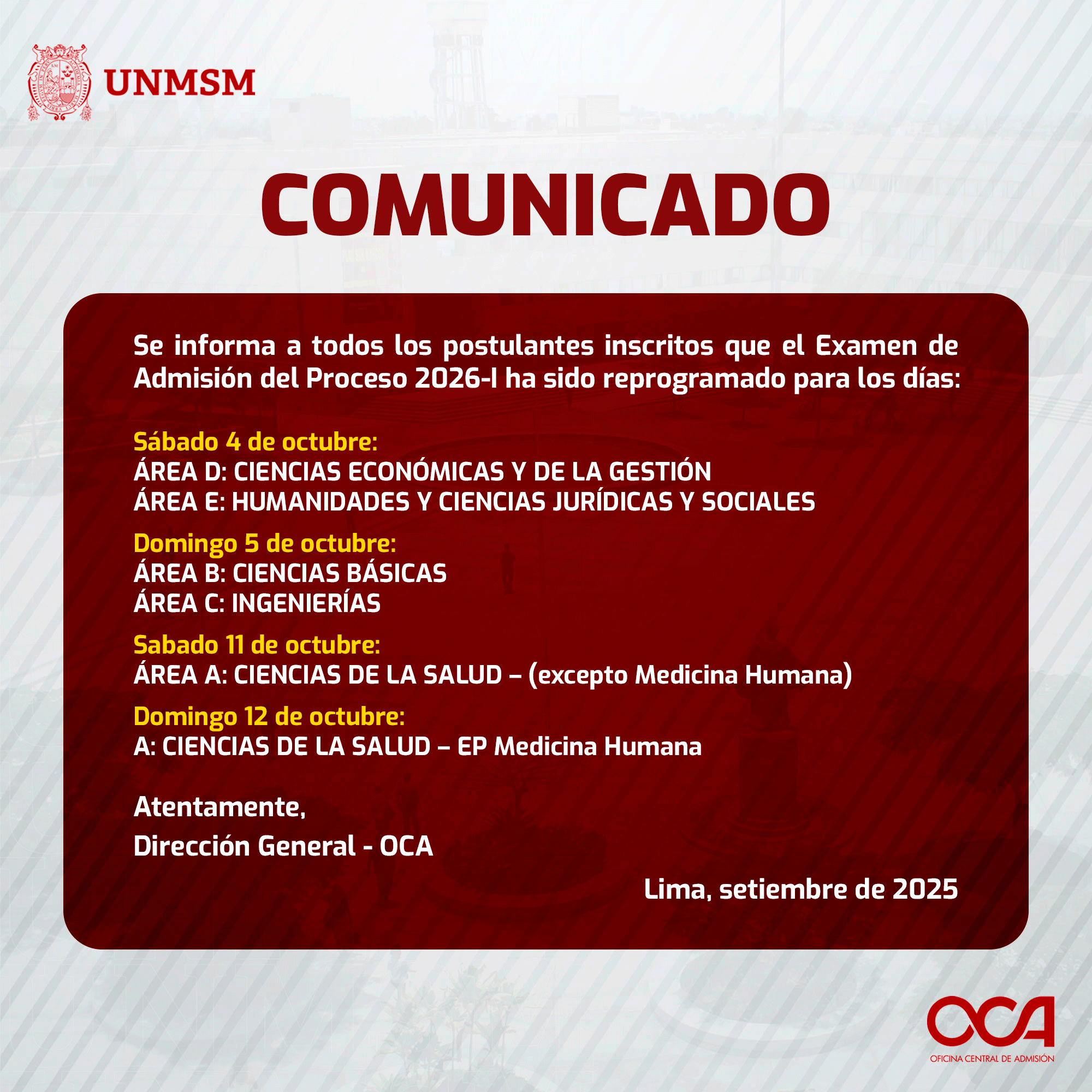 Área A Ciencias de la Salud(Excepto Escuela Profesional de Medicina Humana): 11 de octubre de 2025