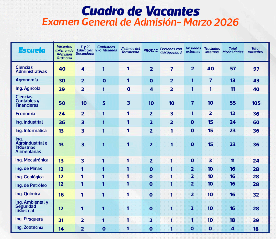 Conozca el cuadro de vacantes por cada carrera profesional