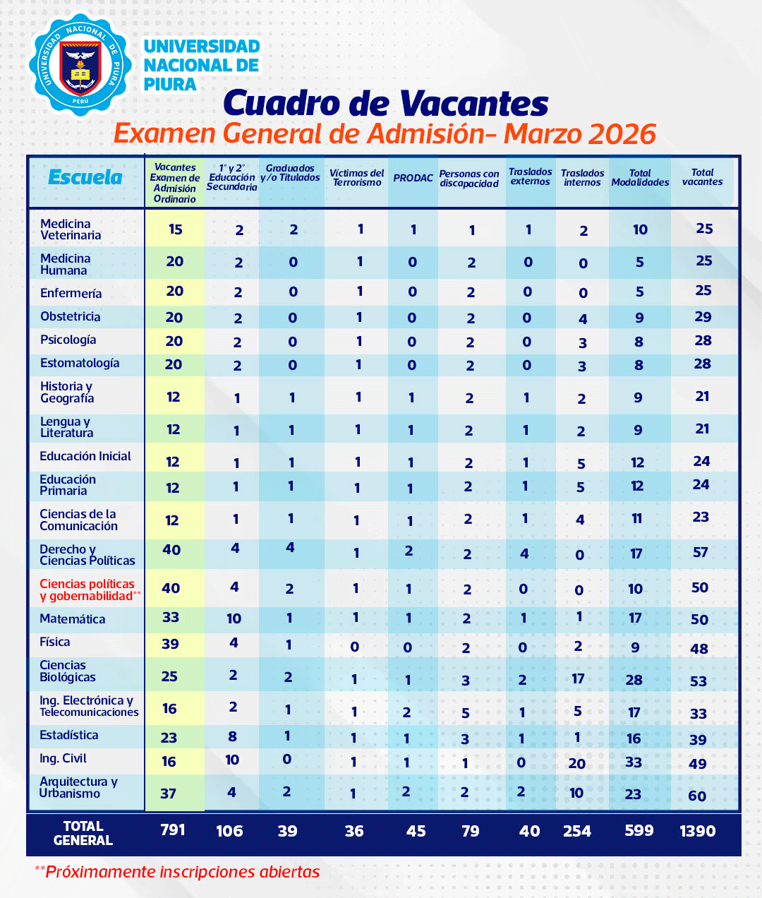 IMPORTANTE: Modalidad de 1er. y 2do. Puestos de Educación Secundaria, Colegio de Alto Rendimiento (COAR), Víctimas del Terrorismo, Deportistas de Alto Nivel, PRODAC y Personas con Discapacidad tienen la siguiente evaluación si es que reúnen los requisitos según Reglamento de Admisión de la Universidad Nacional de Piura: