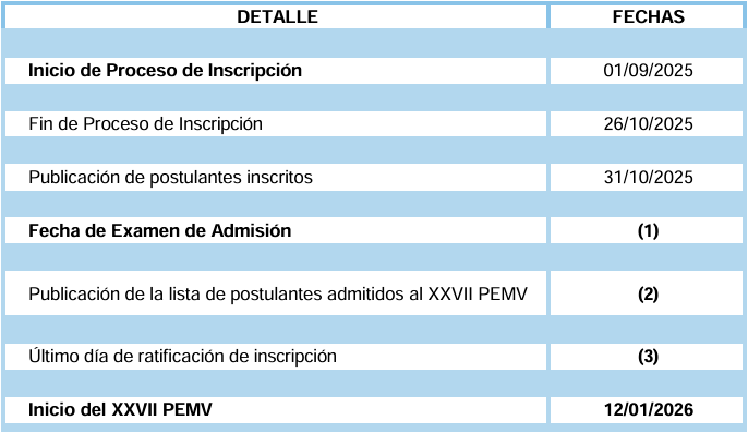 El XXVII PEMV será conducido por una universidad cuya sede principal se encuentre en la ciudad de Lima (en adelante Entidad Educativa) y se realizará en modalidad presencial en las instalaciones ofrecidas por la Entidad Educativa, durante los meses de enero a marzo de 2026. Asimismo, la Entidad Educativa se encargará en el año 2025, de aplicar en modalidad virtual, la Prueba General de Aptitud y Conocimientos (PGAC) para la selección de los participantes del XXVII PEMV.