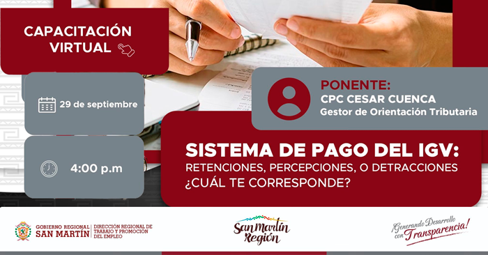 Capacitación virtual gratuita "Sistema de pago del IGV: Retenciones, Percepciones, o Detracciones, ¿cuál te corresponde?" de la DRTPE de San Martín