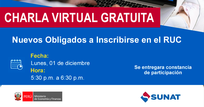 Charla virtual gratuita "Nuevos Obligados a Inscribirse en el RUC" de la SUNAT