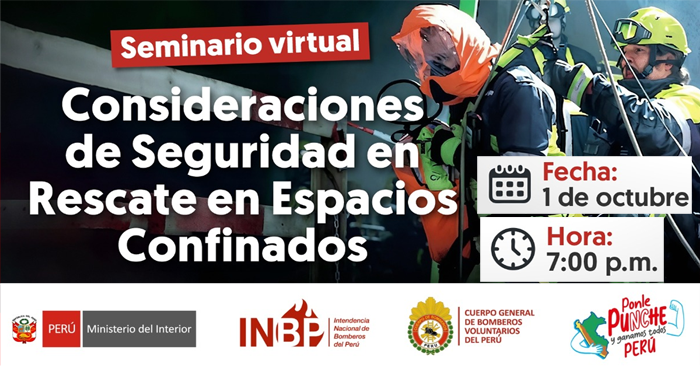 El Comandante General e Intendente Nacional de Bomberos del Perú, Brigadier General CBP Juan Carlos Morales Carpio, invita a todos nuestros hombres de rojo a participar en el Seminario Virtual: “Consideraciones de Seguridad en Rescate en Espacios Confinados”.